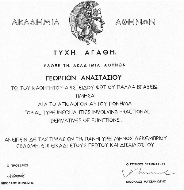 Prof. George Anastassiou was awarded the A. Pallas Award for the best paper in Mathematical Analysis during 98-00 on 12/27/01.